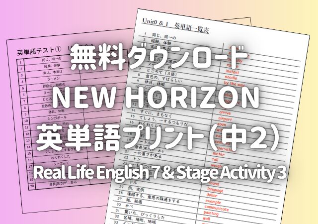 このページでは、東京書籍「NEW HORIZON」中2 Real Life English 7 & Stage Activity 3 の英単語プリントがダウンロードできます。
